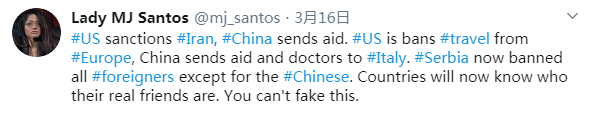 來自挪威的網友直言,“美國製裁伊朗,中國提供援助。美國對歐洲實施旅行禁令,中國向意大利提供援助和醫生。塞爾維亞禁止所有外國人入境,但中國人除外。各國現在將知道他們的真正朋友是誰。你無法否認這個事實。”
