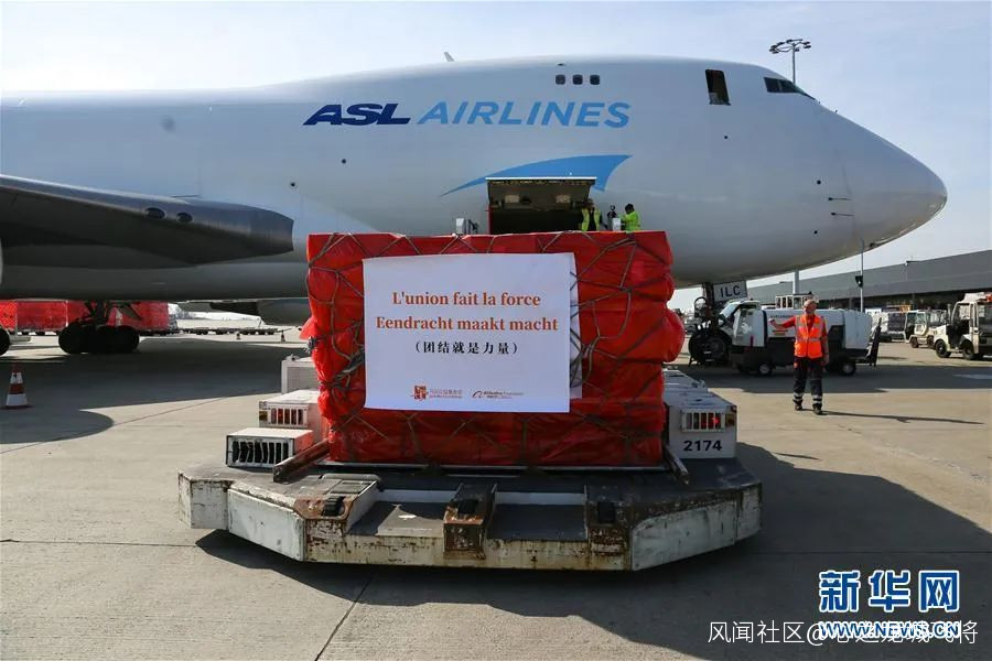 就在半天后,16日中午,來自中國的30萬隻口罩運抵比利時列日機場,這是歐洲新冠肺炎疫情暴發以來,比利時首次得到大規模外來援助。物資由阿里巴巴公益基金會和馬雲公益基金會提供,包裝上用中文寫着“團結就是力量”。