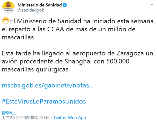 中國援助物資抵達的消息也被西班牙衞生部發布在推特上,引發網友關注。