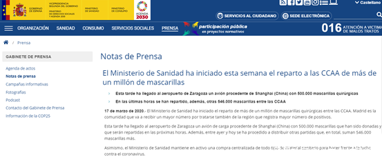 (西班牙衞生部官網截圖) 消息還提到,衞生部門已經開始口罩分發工作。據瞭解,馬德里將獲得的口罩數量最多,因為那裏的疫情最為嚴重。