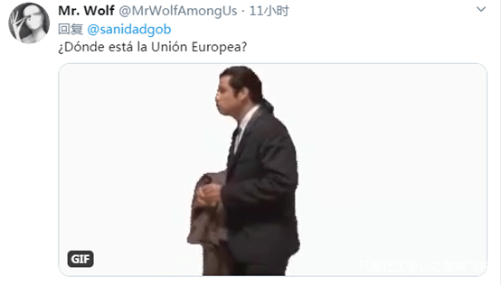 當然,也有網友想起了歐盟。一位網友提問説,“歐盟在哪裏呢?”這位網友還配上了動圖,圖中的主人公不斷左顧右盼,似乎在找什麼東西。↓