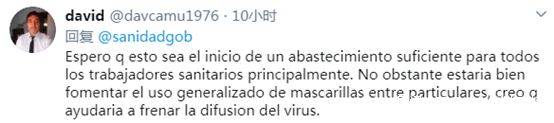 當然,人們最關係的還是西班牙未來的疫情發展。一位網友稱,“我希望這是為所有衞生工作者提供足夠供應的開始。毫無疑問,鼓勵人們廣泛使用口罩是件好事兒,我認為這有助於阻止病毒的傳播。”↓