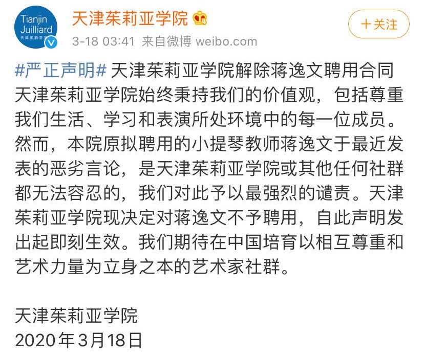 3月18日凌晨3時許,天津茱莉亞學院在官方微博發佈嚴正聲明,宣佈解除蔣逸文聘用合同。