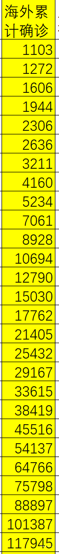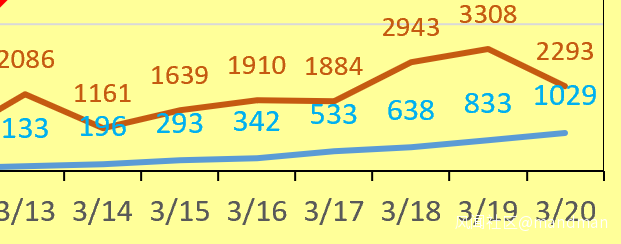 剛才算了一下,海外增長的速度還是在放慢的,從1000增長到10000,花了11天,從10000增長到100000,花了14天;這裏面應該主要是檢測限的問題(全球前三意大利、伊朗、西班牙檢測能力飽和了),和病毒傳播速度無關。
