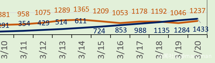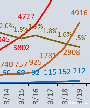 意大利、西班牙、伊朗的新增病例都開始走平了,感覺已經到了檢測極限了(伊朗就是每天確診一千、西班牙是兩千,意大利是四千)