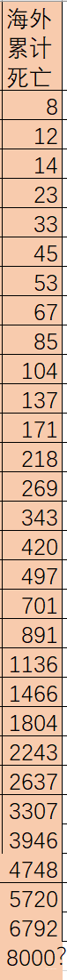 這麼看來,通過死亡人數反推,可能更準一些(這個檢測的例數要少一個數量級,而且死者的檢測順位優先):從8人到80人,花了8天;從80人到800人,花了10天;從800人到8000人(應該就是今天),花了11天,減速並不明顯。