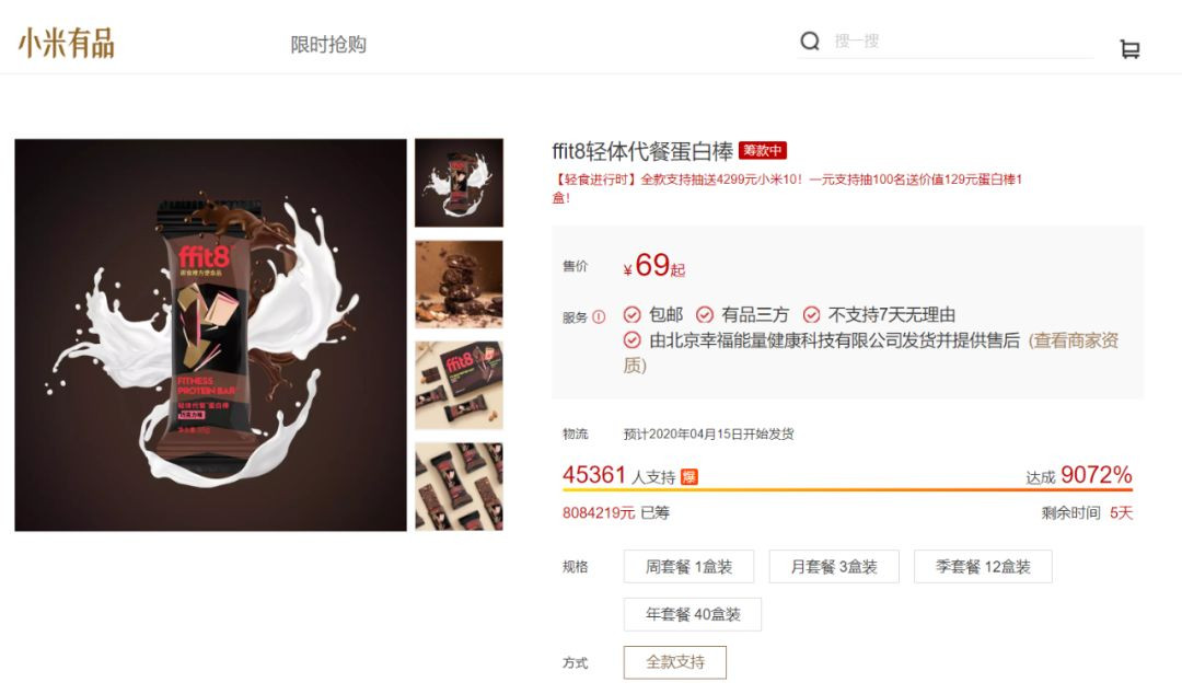 從品類上看,小米有品的眾籌本身是一個主打新奇酷產品首發的欄目,ffit8輕體代餐蛋白棒是小米有品眾籌的第一款代餐產品。