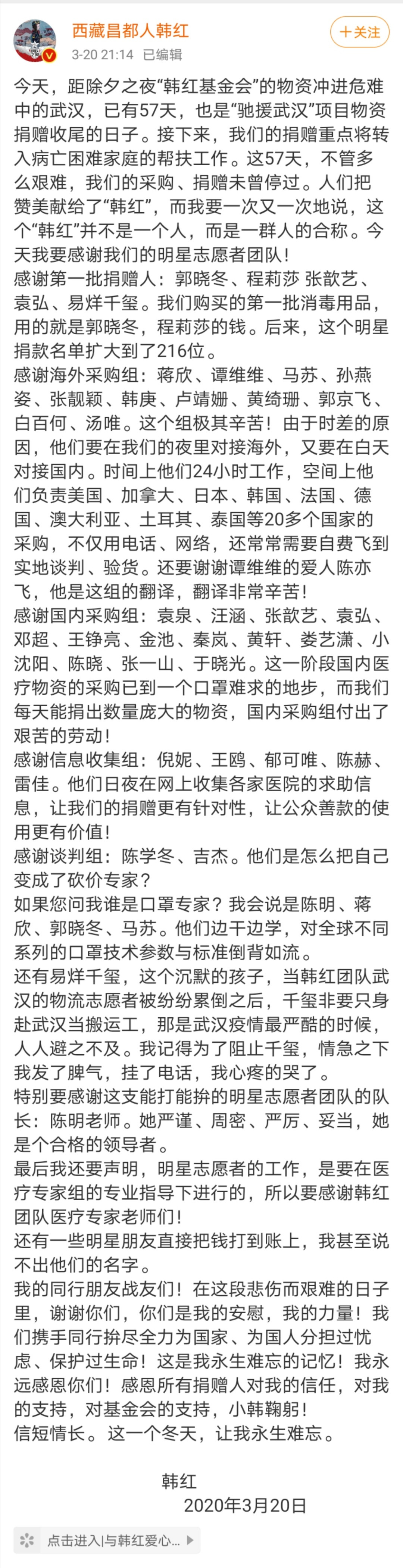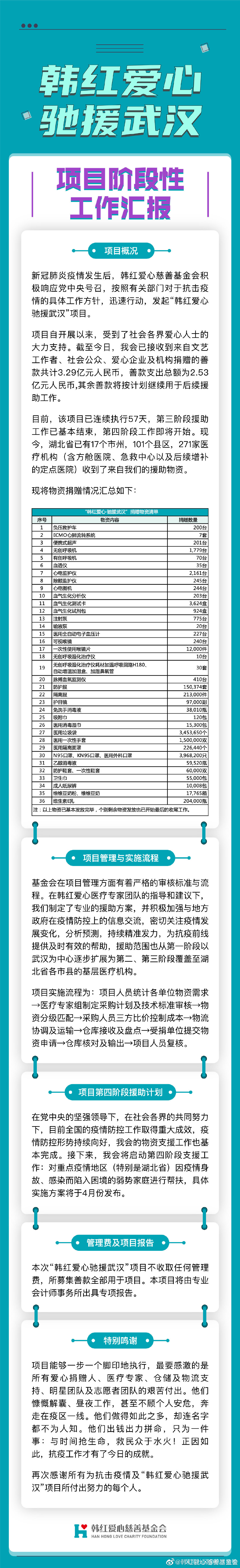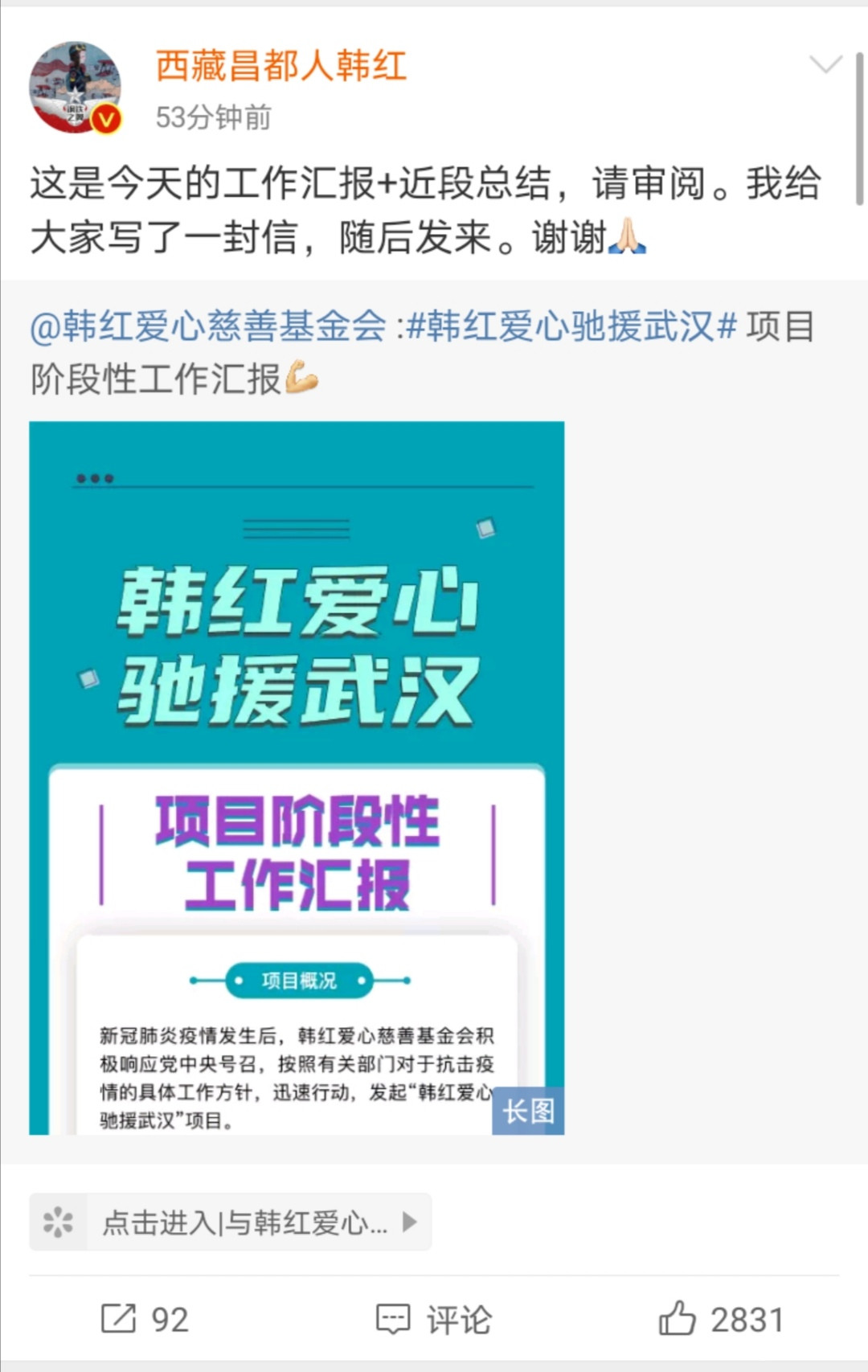 韓紅微博發佈“馳援武漢”項目階段性工作彙報_風聞