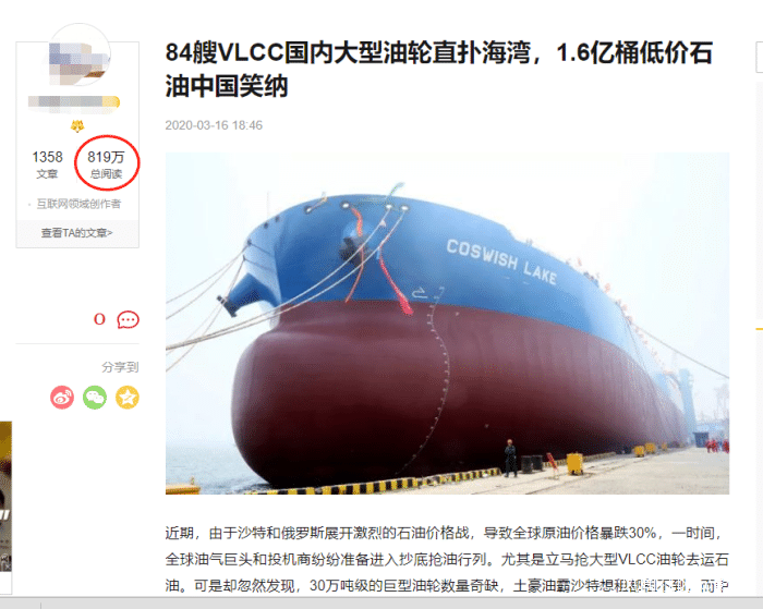 昨夜今晨,伴隨國際油價的暴跌,一篇自媒體文章“中國84艘巨輪直撲海灣”刷屏,而且相關文章閲讀量巨大,影響深遠。