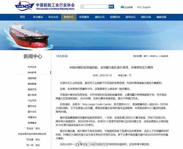 但是,有細心人士發現了,船舶業協會官網的這篇新聞比“84艘巨輪搶購油”的原始自媒體發佈晚了一天,於是,小編還給出了自己的判斷:這就是美國人為了拉油價救債市發的假新聞帶風向。