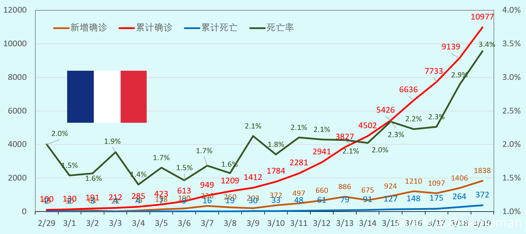 **法國:**新增病例數為1838例,環比增加31%;累計確診9139例,環比增加20%;百萬人口確診率為164;新增病亡108例,累計372例,環比增加41%;百萬人口死亡率為5.6;病亡率3.4%,繼續上升。法國的抗疫形勢迅速惡化,上週末頂風作案的地方選舉,要承擔極大的責任。
