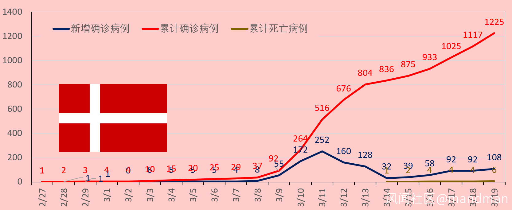 **丹麥:**新增108例,累計1225例;百萬人口確診率為211;新增死亡病例2例,累計病亡6例。丹麥自3月11****日起只檢測重症患者,數據不實。