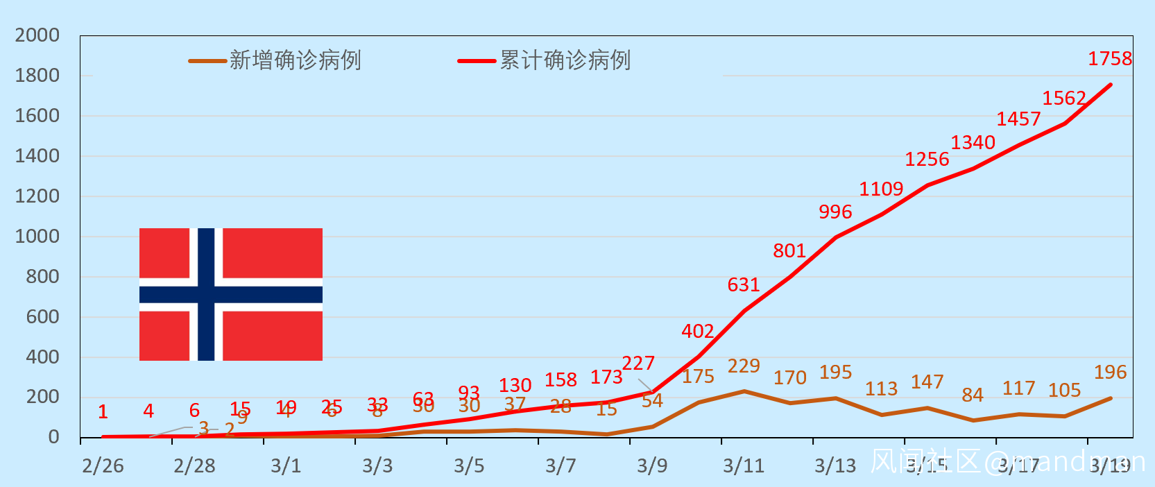 **挪威:**新增196例,累計1758例,百萬人口確診率為331,僅次於意大利、瑞士。挪威自3月11****日起只檢測重症患者,數據不實。