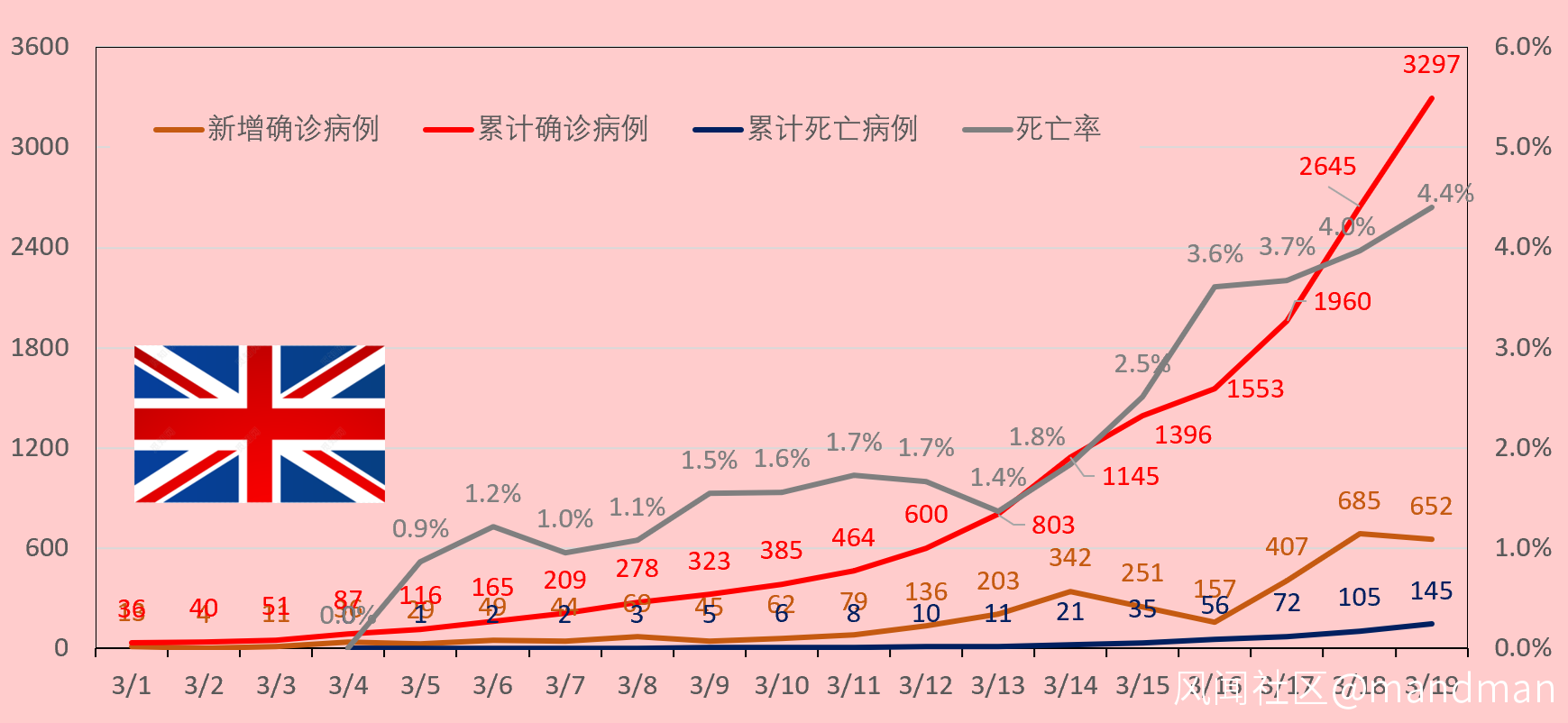 英國:新增652例,環比減少33例;累計3297例,環比增長25%;百萬人口確診率為50;新增死亡病例40例,累計145例,死亡率4.4%。英國的病例數明顯偏低,新增確診病例趨勢不符合傳染病規律,死亡率卻已經明顯上升,超過了法國。在殘酷的疫情面前,英國政府被迫採取更積極的措施,但仍然在檢測標準上做文章,弄虛作假。