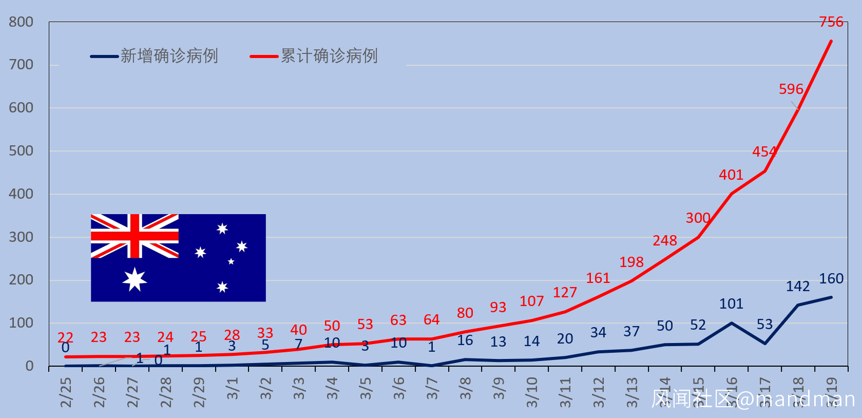 澳大利亞:新增160例,前三天為101、63、142例,呈快速增加態勢,累計756例;百萬人口確診為30;新增病亡1例,累計病亡7例。澳洲疫情尚處於早期起步階段。