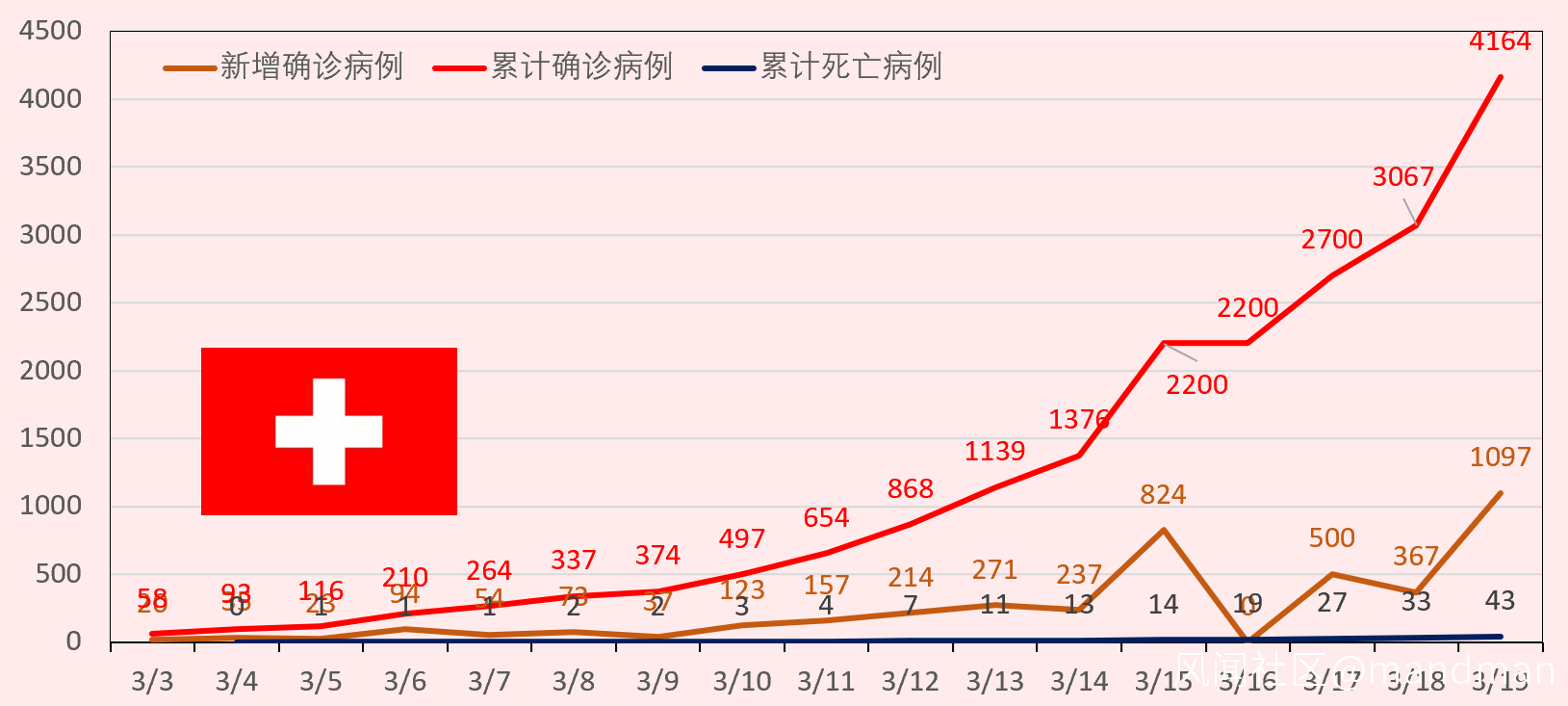 **瑞士:**新增病例1097例,環比增加200%;累計4164例,環比增加36%;百萬人口確診率為490,僅次於意大利,名列歐洲第二;新增死亡10例,累計死亡43例。瑞士數據暴漲,是否是因為放寬了檢測標準,需要繼續觀察。