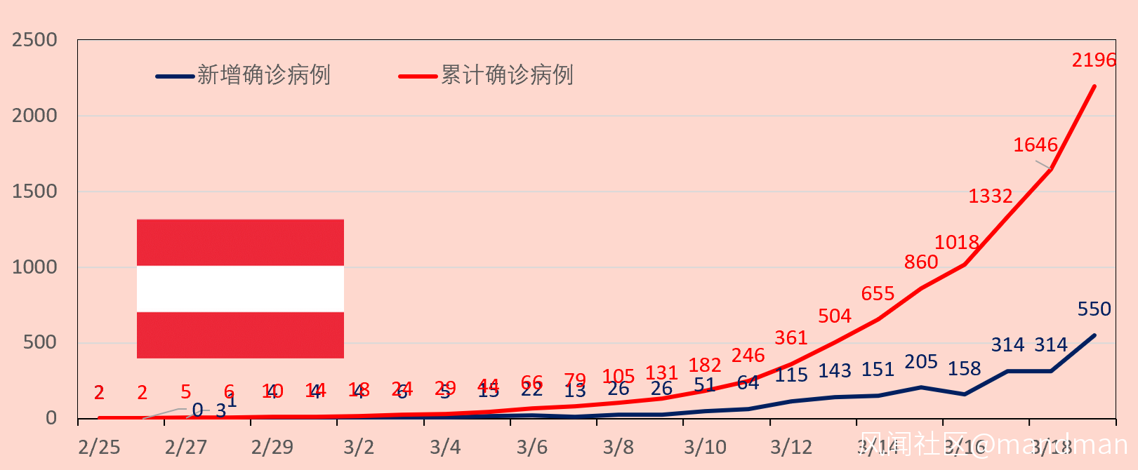 **奧地利:**新增550例,前三天為158、324、314例,快速增加;累計2196例,環比增加33%;百萬人口確診率為248;累計病亡6例。