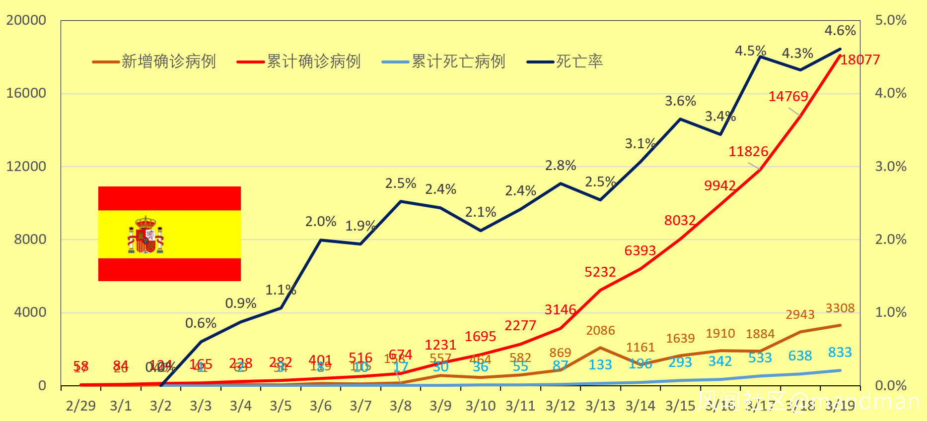 **西班牙:**新增病例數為3308例,環比增加12%;累計確診18077例,環比增加22%;百萬人口確診率為387;新增死亡病例195例,累計833例,環比增加31%;百萬人口死亡率為18;病亡率為4.6%,繼續上升。西班牙確診人數、死亡人數增速驚人,往意大利的道路上狂奔,西班牙政府已經宣佈將全國所有的醫療機構全部國有化,統一抗擊疫情,前景不容樂觀。