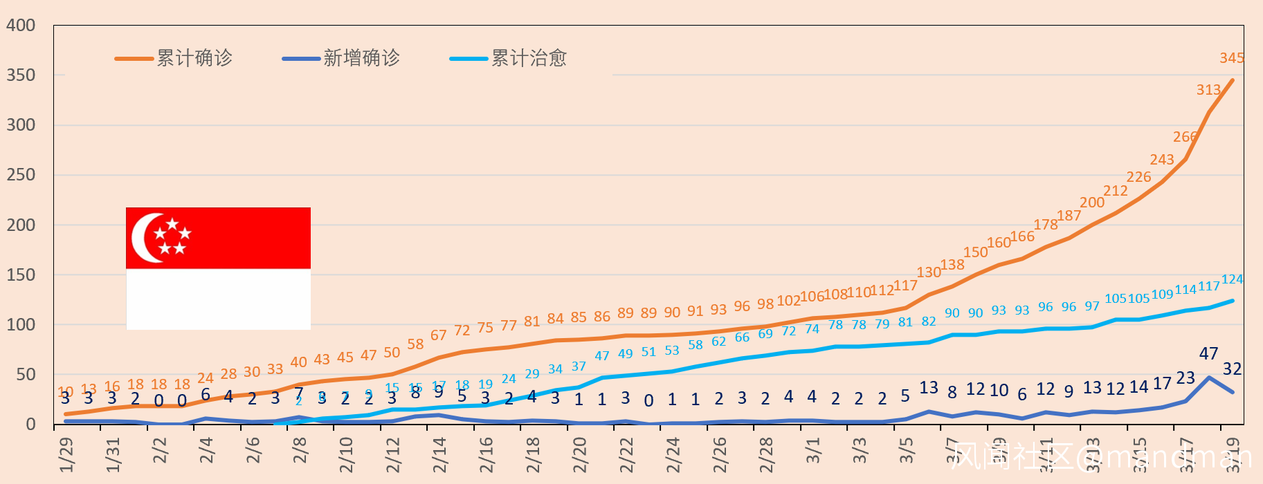 **新加坡:**新增32例,其中境外輸入24例,累計確診345例,百萬人口確診率為61;新增出院7例,累計出院124例;目前住院病例221例;重症患者15例。在嚴密防控下,新加坡的病例數繼續小步增加,作為國際航空中心,境外輸入日益成為新加坡不可承受之重,這是對新加坡政府抗疫工作的極大挑戰。