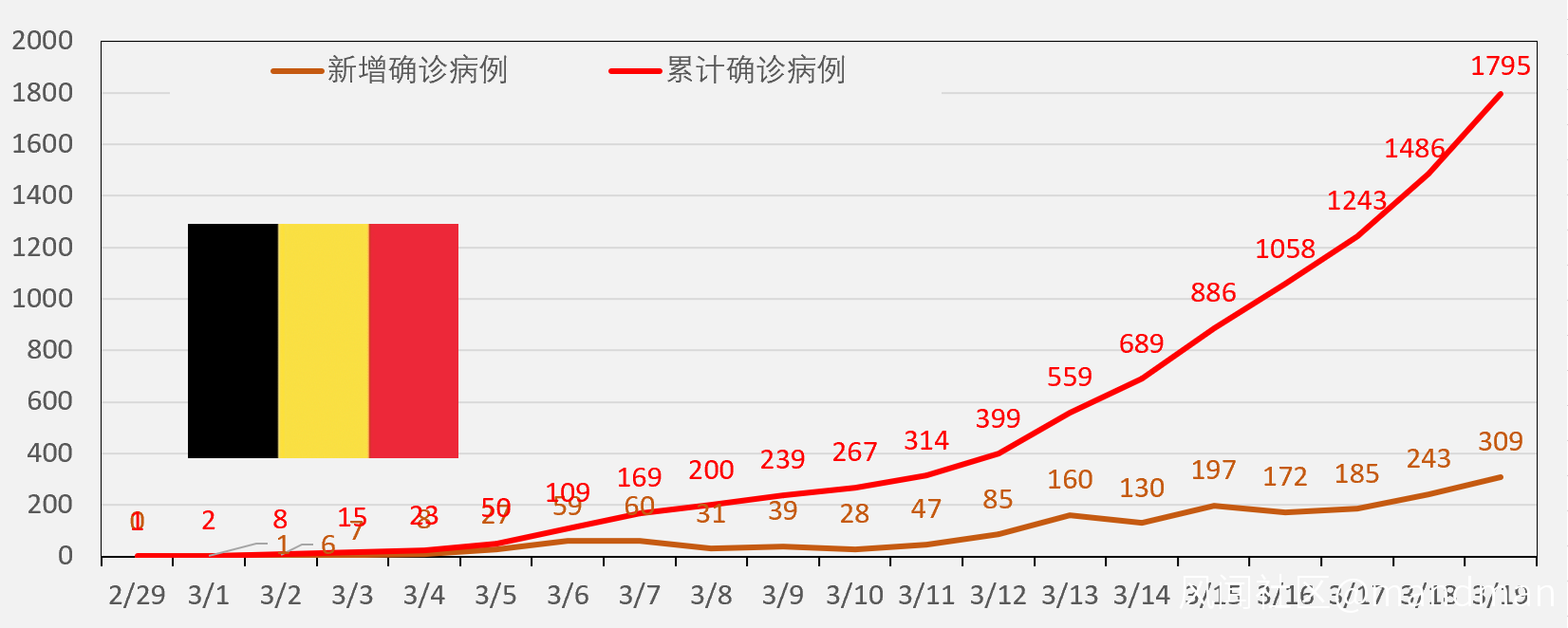 **比利時:**新增309例,前三天為172、185、243例,加速增加;累計1795例,百萬人口確診率為157;新增死亡病例7例,累計21例。