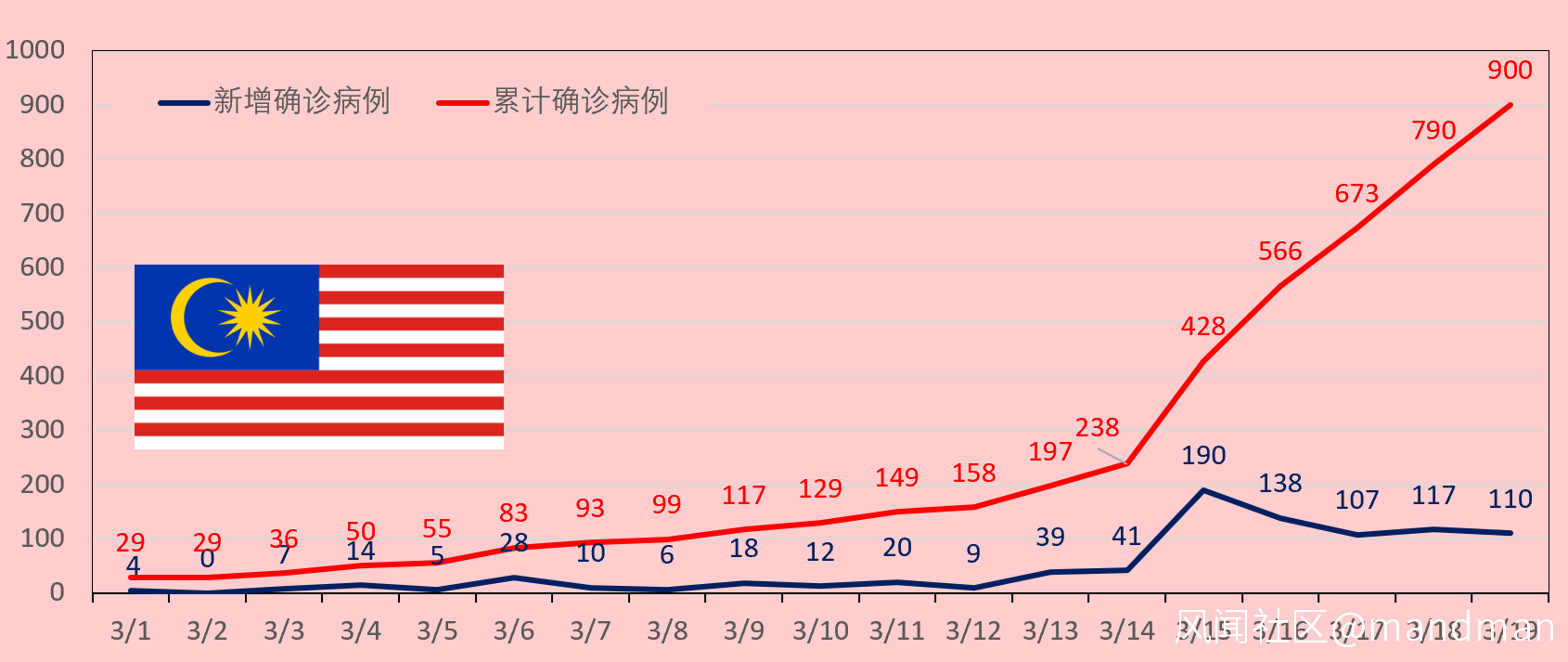 **馬來西亞:**新增110例,累計900例,百萬人口確診率為29。馬來西亞的數據與病毒傳染規律不符,有瞞報跡象。