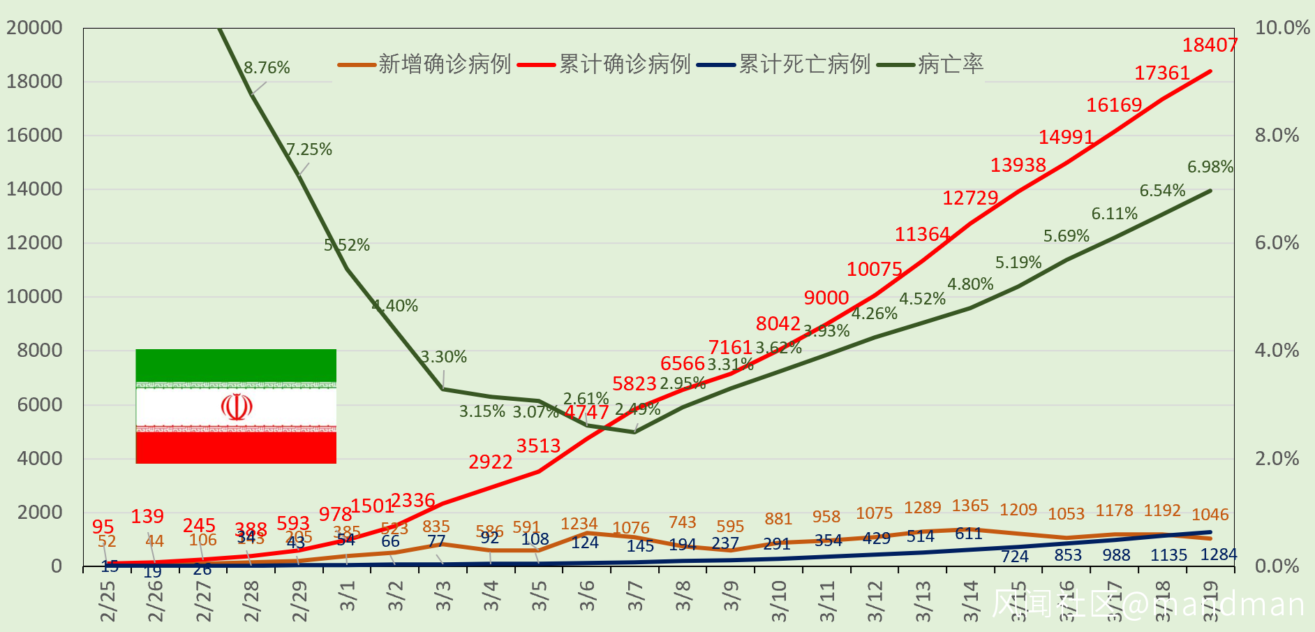 ps. 領先的幾個國家:意大利、伊朗、西班牙近一週的確診病例已經躺平了,估計是到了檢測極限了;美國昨天確診5000例,是除中國之外一國單日確診數量最多的一天,顯示了美國的強大實力。