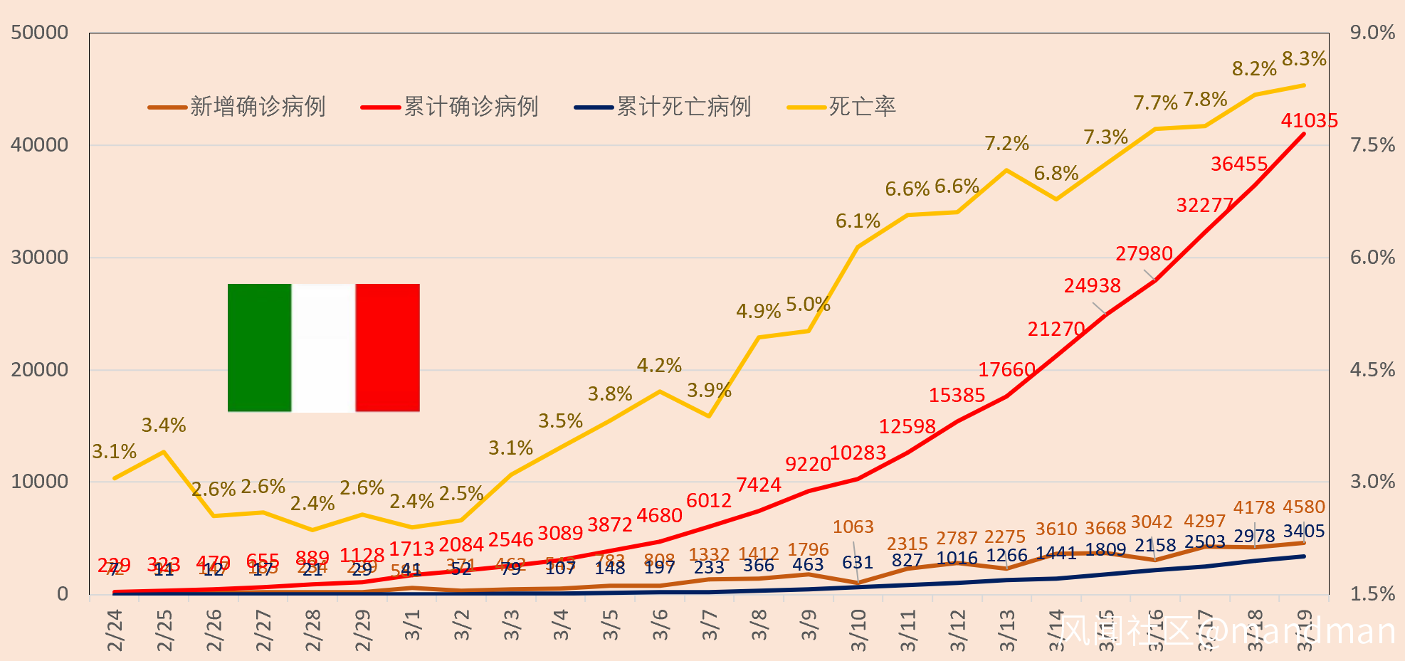 **意大利:**疫情繼續發展, 截止當地時間19日24點,單日新增4580例;累計確診41035例,環比增加13%,首次突破40000大關;百萬人口確診率為479,高居全球百萬以上人口國家之首;病亡增加427例;累計死亡3405例,環比增加14%;百萬人口死亡率為56;累計確診病例列全球第二,僅次於中國;病亡病例超過了中國,成為全球第一;病亡率高達8.3%,繼續上升,高居全球之首。意大利的醫療體系已經崩潰,院內感染廣泛發生,10%以上的患者是醫護人員,醫院被迫選擇性收治患者,大批量動用軍車運送棺木,人間慘劇!我國醫療團隊已經開始成建制地援助意大利,希望他們能夠發揮作用。