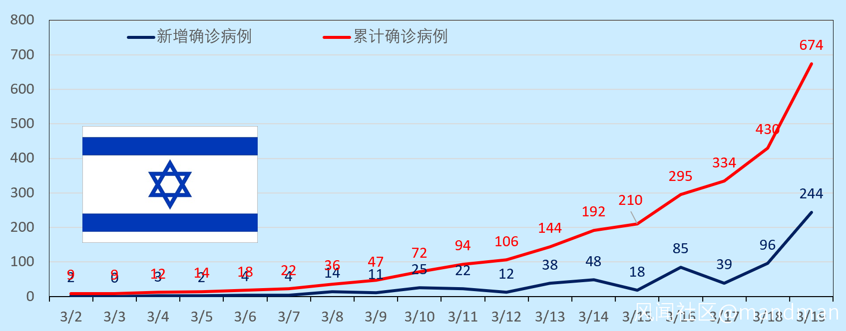 以色列:新增244例,快速增長,累計674例,環比增加57%,百萬人口確診率為76。