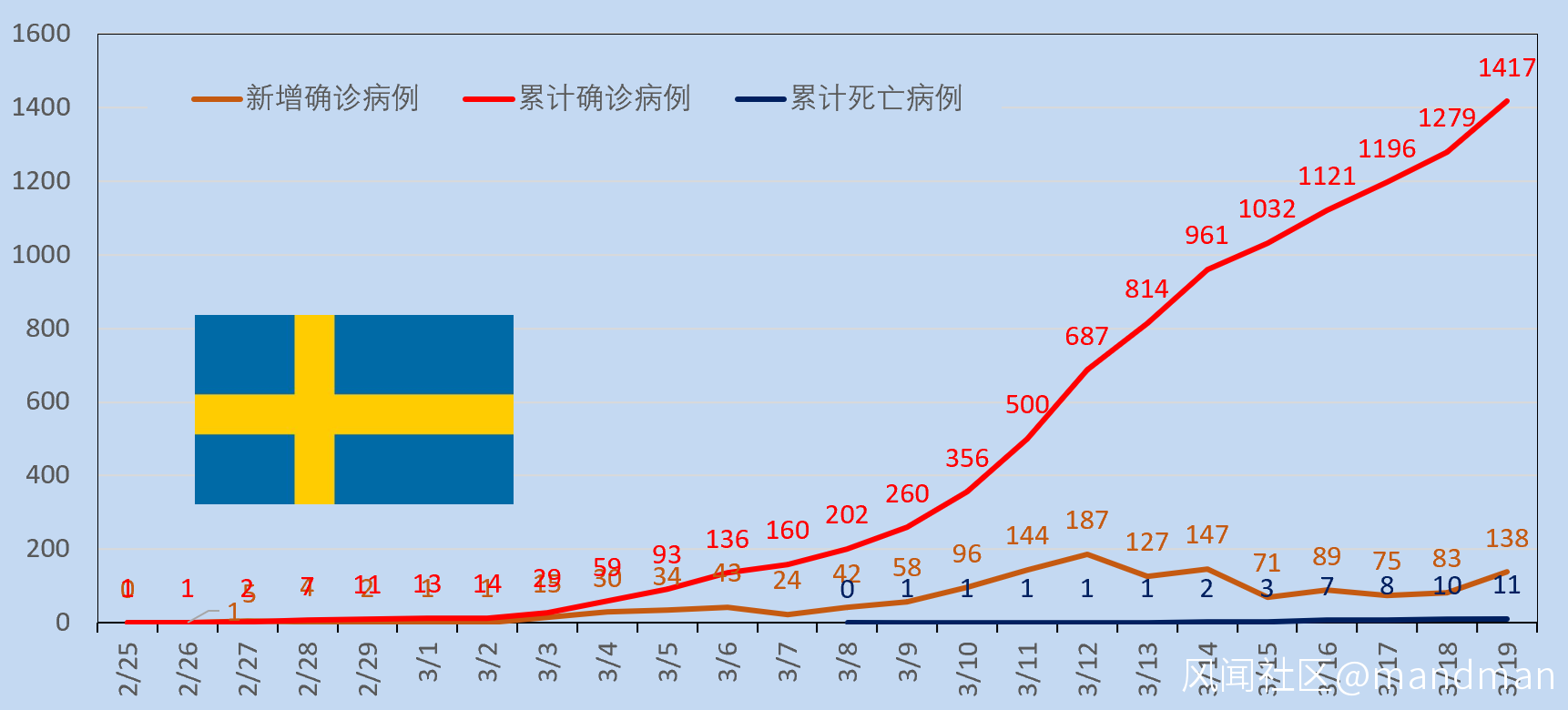 **瑞典:**新增138例,累計1417例,百萬人口確診率為139;新增死亡病例1例,累計11例。瑞典自3月11****日起只檢測重症患者,數據不實。