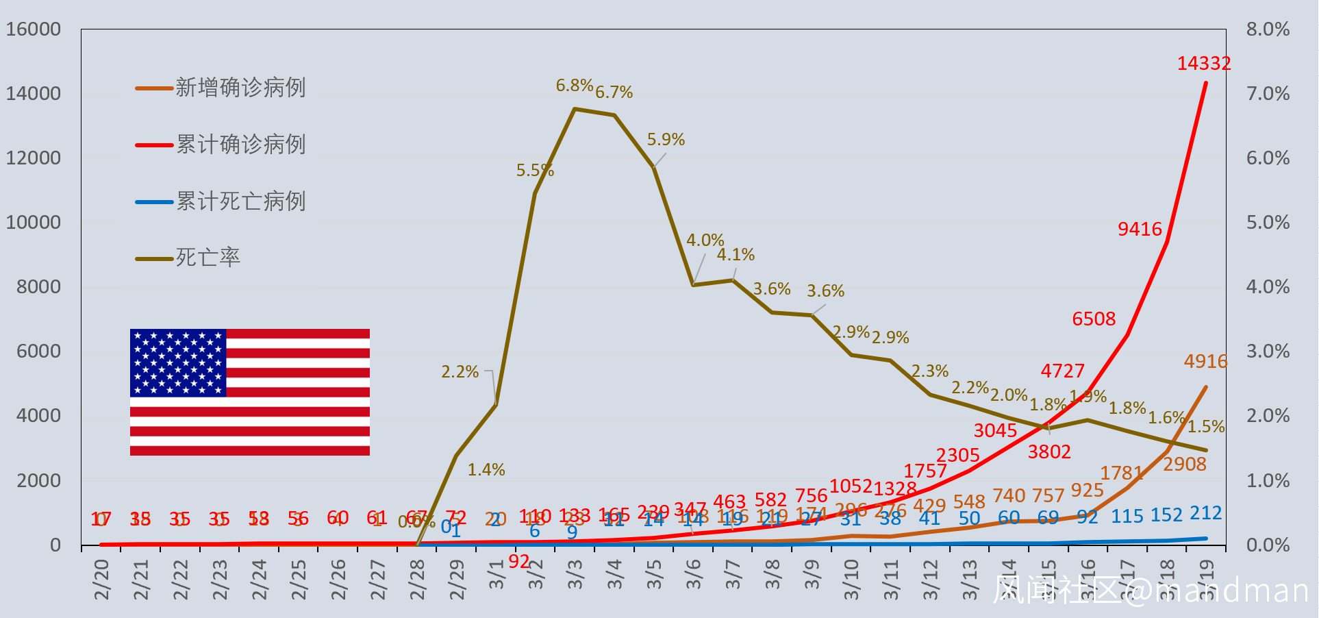美國:新增4916例,環比增加69%,前三天為925、1781、2908例,呈爆炸性增加態勢,累計14332例,環比增加52%;百萬人口確診為44;新增病亡60例,累計212例,病亡率為1.5%。由於疫情嚴重,美國多地宣佈封城。美國的病例檢測嚴重不足,確診病例嚴重低估,預計美國後續的確診病例將出現持續指數級增長。由於疫情失控,大統領瘋狂甩鍋中國,使出了種族主義的卑劣手段,令人憤慨。
