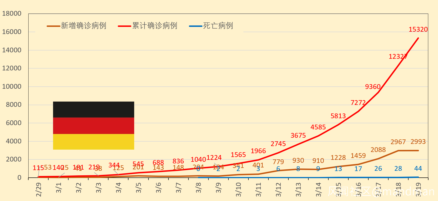 **德國:**新增病例數為2993例;累計確診15320例,環比增加24%;百萬人口確診率為185;新增死亡16例,累計死亡44例。由於ICU牀位數準備充分,德國的死亡率尚處於低位,但飛速增加的確診病例,恐怕遲早會擊穿醫療資源的極限。德國多次強徵過境的醫療用品,其國民性可見一斑。
