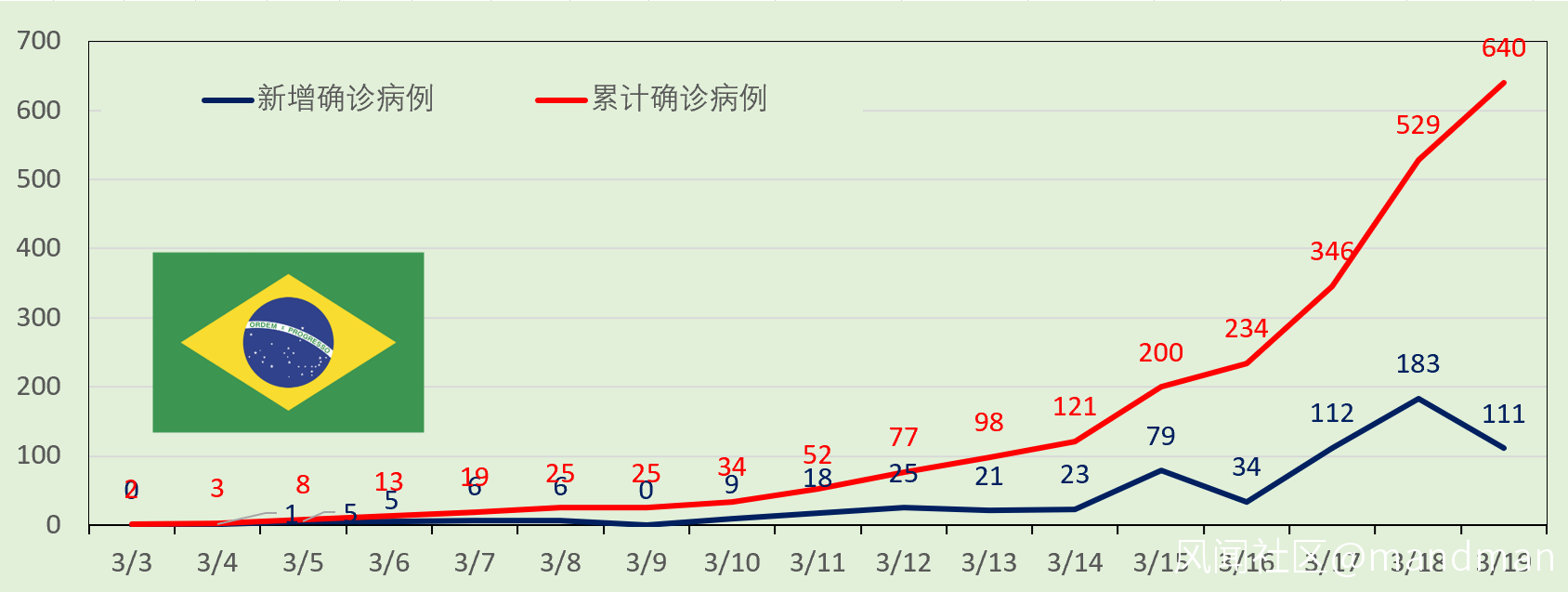**巴西:**新增111例,前三天為34、110、183例,呈快速增加態勢,累計640例,環比增加21%;百萬人口確診為3;新增病亡3例,累計7例。巴西的疫情尚處於早期起步階段。