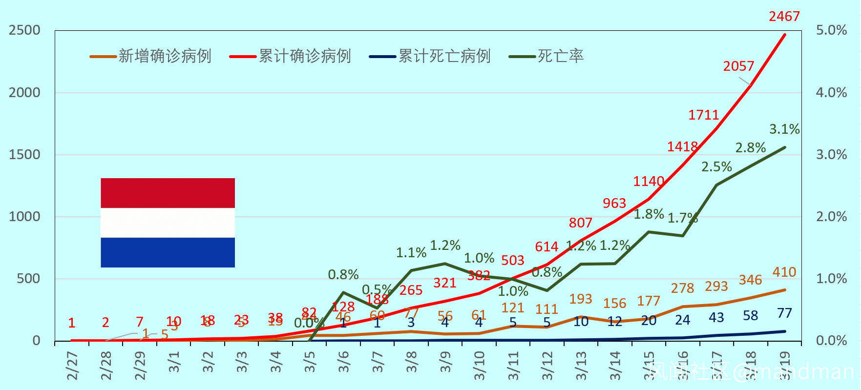 **荷蘭:**新增410例,前三天為278、293、346例,呈快速增加態勢,累計2467例,環比增長20%;百萬人口確診率為143;新增死亡19例,累計77例,死亡率為3.1%,快速上揚。