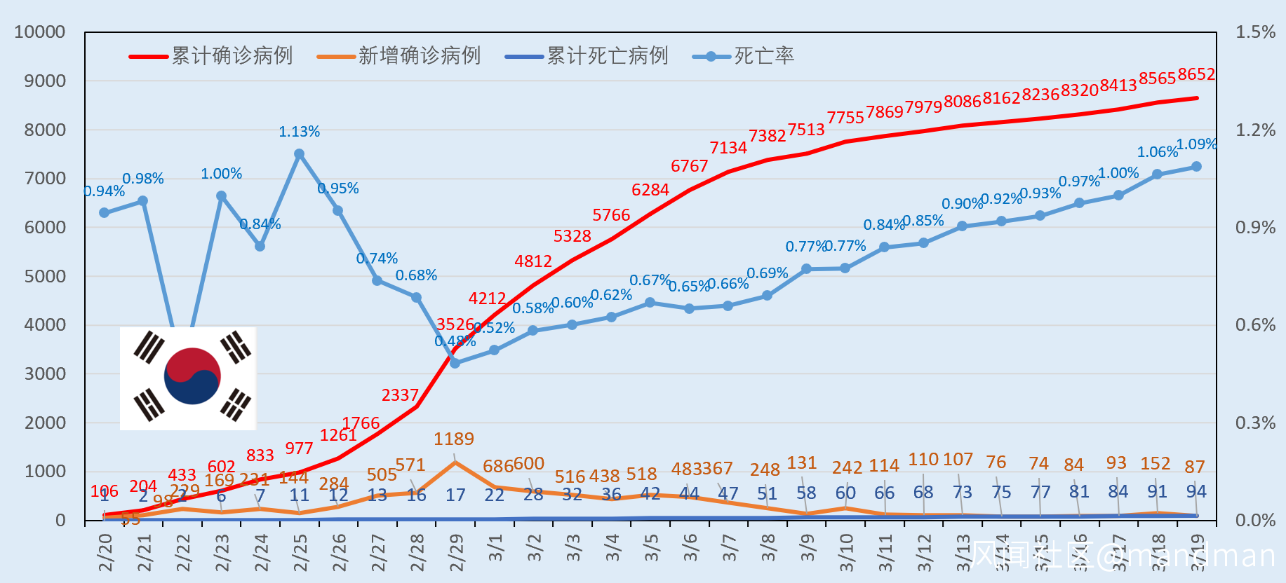 **韓國:**新增確診病例87例,環比有所下降;累計確診8652例,百萬人口確診率為168;病亡增加3例,累計94例,百萬人口死亡率為1.82,病亡率為1.1%。韓國疫情整體控制得不錯,應檢盡檢,檢測的病例數僅次於中國,確診病例低速增加,死亡病例緩慢增加,病亡率控制在1%左右,顯示抗疫工作的有效性。