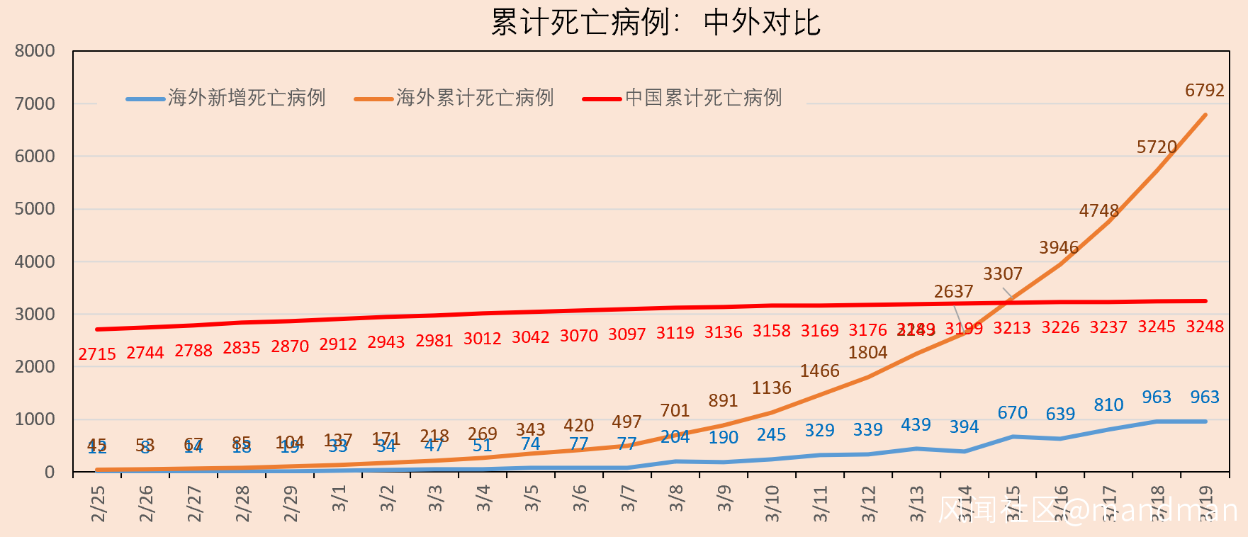 新冠疫情呈全球加速蔓延態勢,累計確診超過24萬例,病亡逾萬例,已經成為1918年西班牙流感以來最嚴重的瘟疫,境外病亡率已經反超境內,確診病例、死亡病例已經達到了境內的兩倍,且毫無減速跡象。全球股市連續大跌,美股兩週內連續四次熔斷,史無前例,後續逐漸發展成全球的債務危機、金融危機和經濟危機的趨勢。由於美、英、德、丹、瑞典、瑞士、挪威等西方發達國家坦然接受新冠病毒的廣泛傳播現實,新冠病毒疫情後續發展將更加嚴峻,這些佛系國家將持續向外輸出病原,為全球帶來更大的威脅。