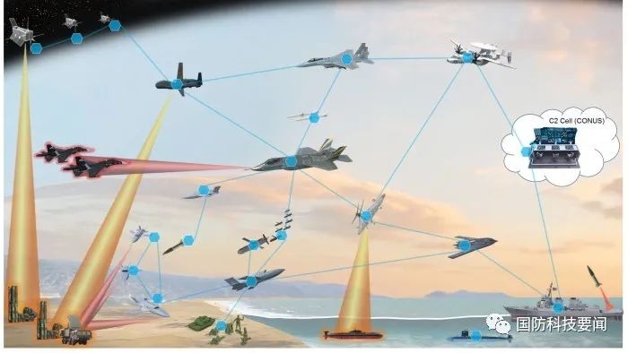 當前,美軍在 太空、空中、地面、水面、水下、網電等作戰域擁有眾多殺傷鏈,其典型流程為:傳感器將獲取的目標數據發送至平台,平台根據這些數據發射武器對目標進行殺傷。這些殺傷鏈通常是線性的,並只在單個作戰域發揮作用。而美軍新的“多域戰”“分佈式作戰”“蜂羣作戰”“馬賽克戰”等作戰概念均強調,在多域戰場空間分散部署 “小、散、快、融”互聯互通互操作的兵力和裝備,並將這些殺傷鏈交叉重構,形成覆蓋陸海空天網電各作戰域的“殺傷網”,從多個方向、多條戰線、多個領域使任意武器平台可獲取任意傳感器信息,實現跨域感知和跨域打擊,令對手疲於應付、無法兼顧。
