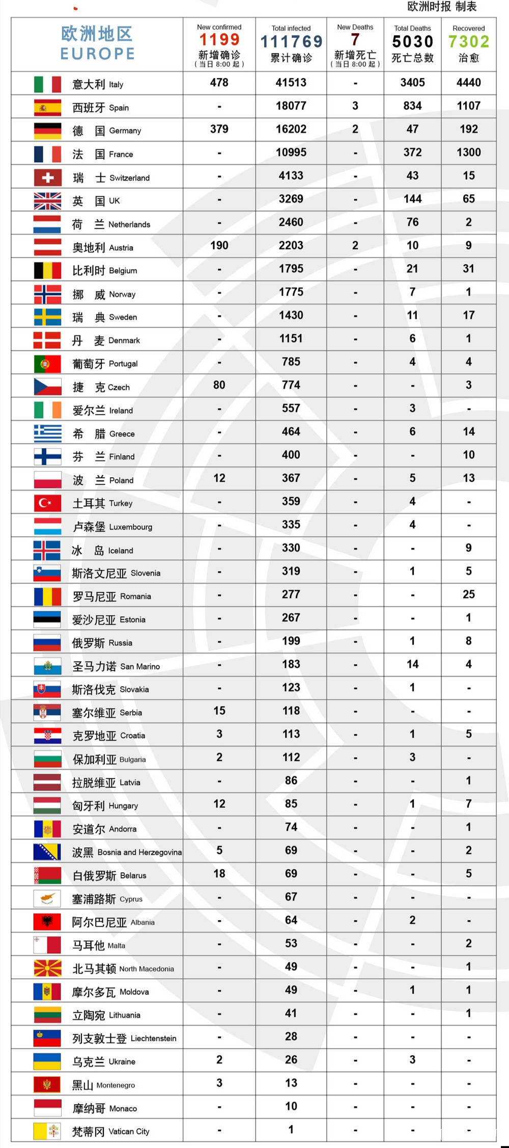 歐洲最新疫情,截止到巴黎時間2020年3月20日11時,圖源:歐洲時報。