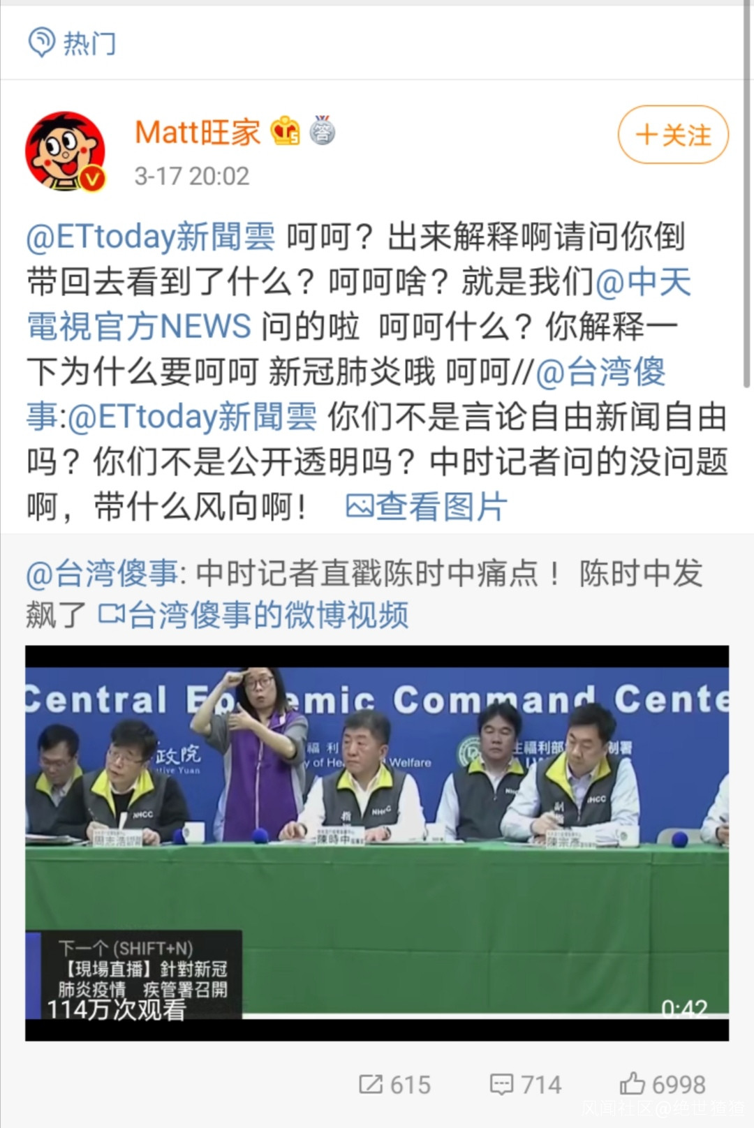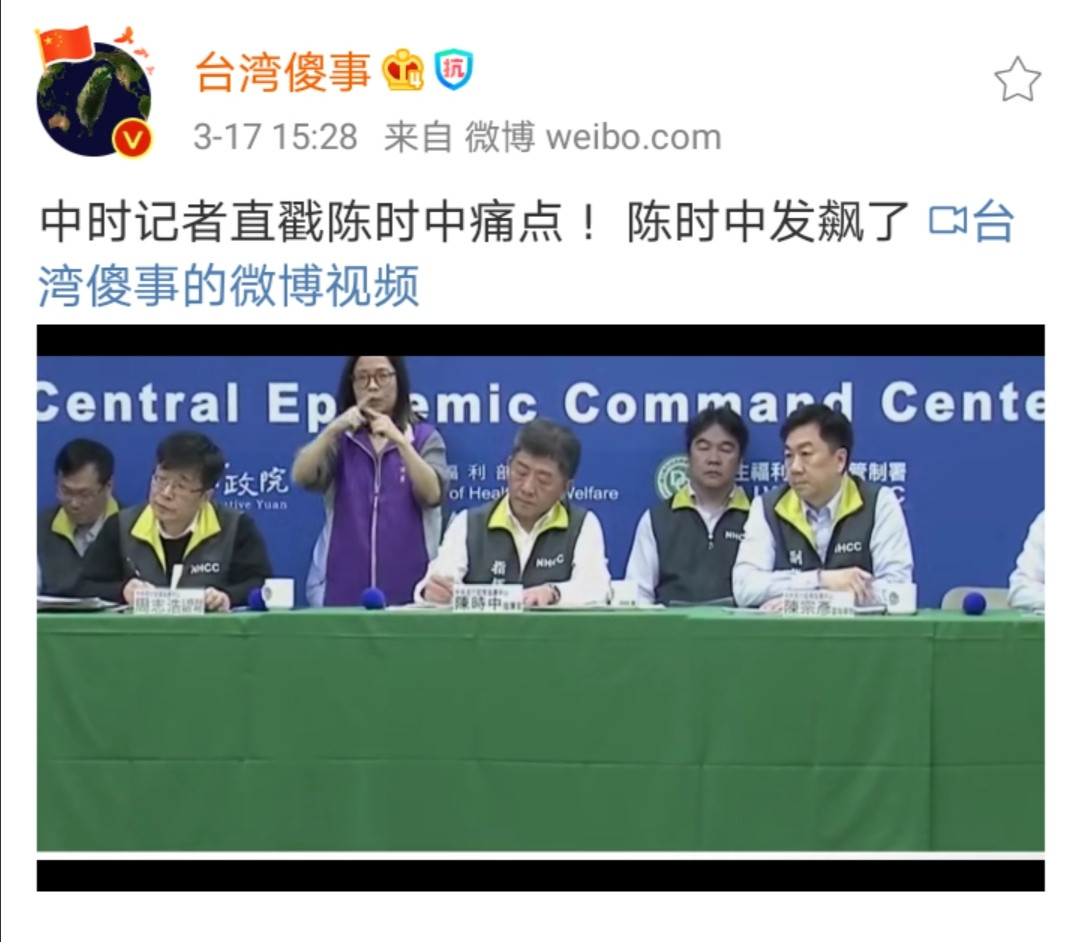 事情的起因,是17號那天,@台灣傻事 發佈了一段台灣記者會的視頻,視頻中,中時記者就新冠疫情理性發問,陳時中卻被戳中痛點發飆。