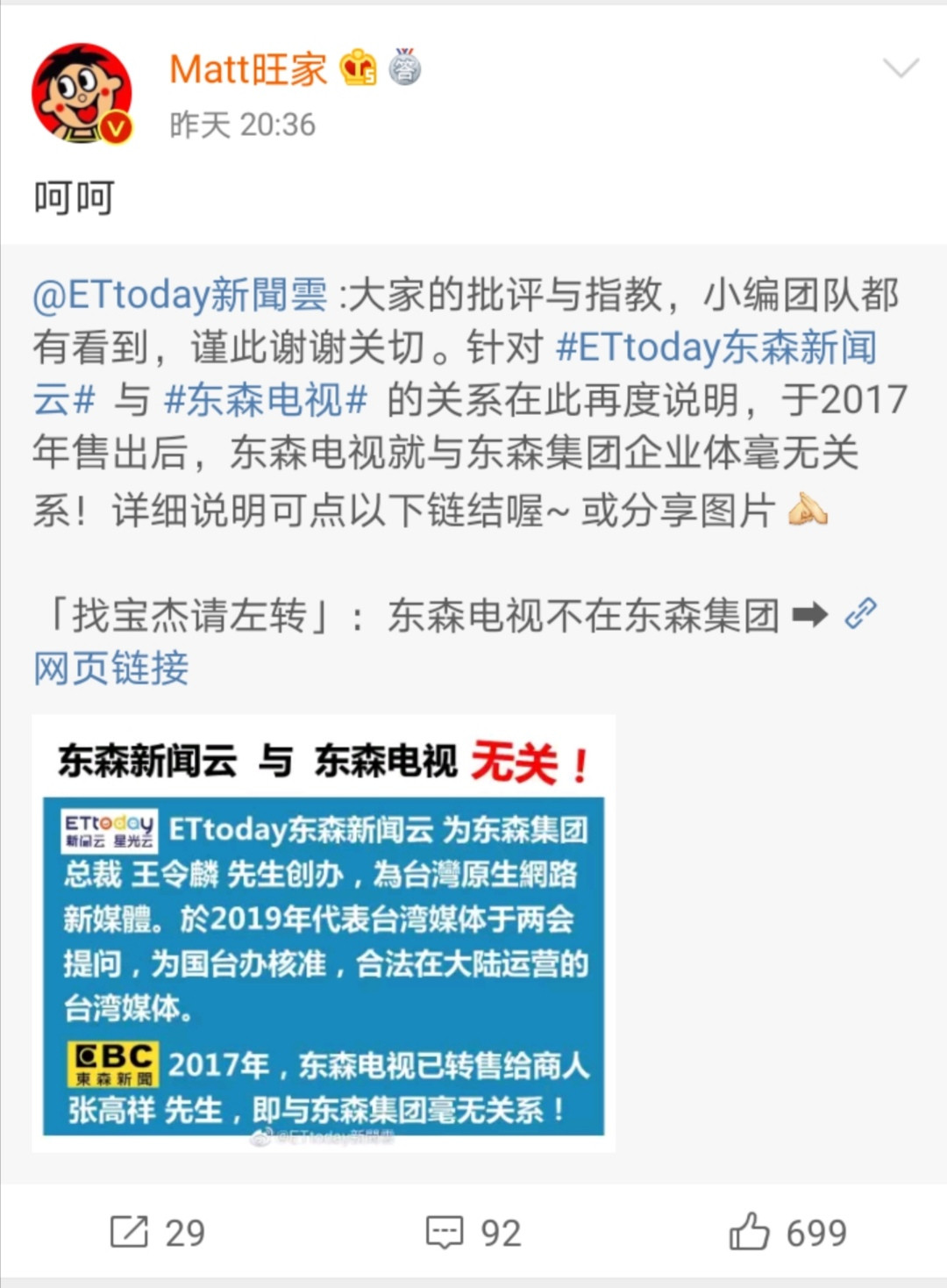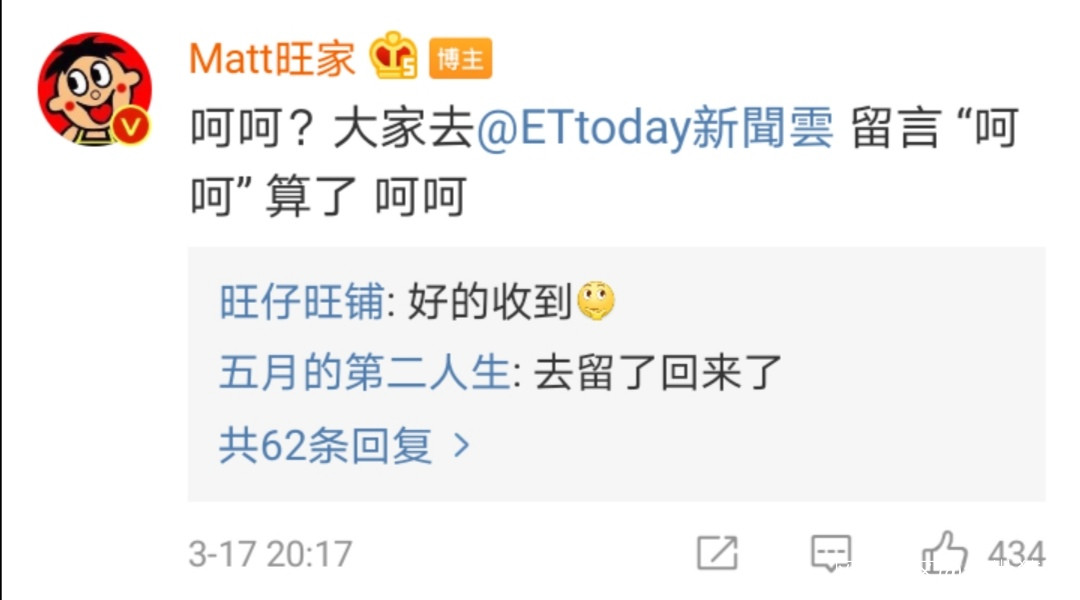 旺旺集團首席營運官@Matt旺家站出來,直接@ETtoday新聞雲 質問:呵呵啥?倒帶回去看到了什麼?出來解釋清楚啊?
