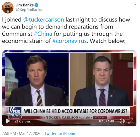 2020-03-19 21:20 【環球網報道 記者 烏元春】“我們需要從迫使中國支付新冠病毒給美國造成的負擔和成本開始,我認為我們有很多方法可以做到這點。(比如)總統應該迫使中國減免一大部分美國債務……”在3月16日晚美國福克斯新聞台旗下節目“塔克·卡爾森今晚”中,一個名為吉姆·班克斯(Jim Banks)的美國共和黨籍眾議員居然給特朗普政府支出了這樣的“損招”。隨即連美國網友都看不下去了,批評這簡直是製造“戰爭言論”。