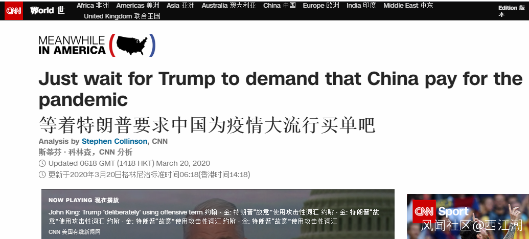 CNN挖苦:就等着特朗普要求中國為疫情大流行買單吧_風聞