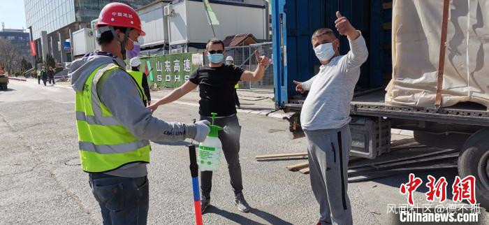 中方施工人員為塞爾維亞當地司機消毒。中建八局一公司供圖
