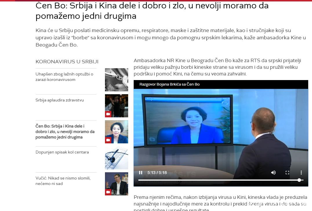 駐塞爾維亞大使陳波接受塞國家電視台連線採訪:爭取中國物資和專家儘快抵塞_風聞