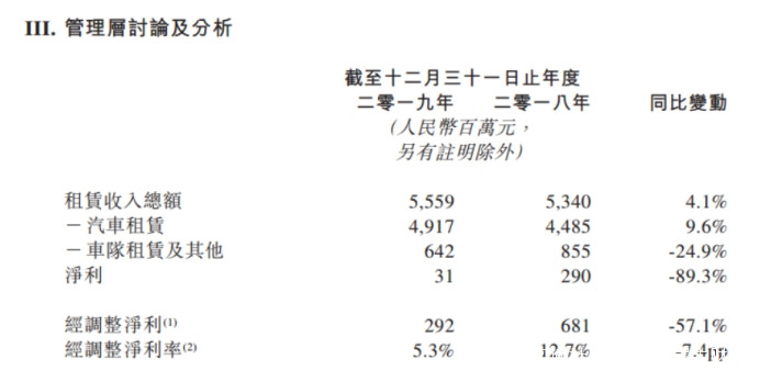 神州租車2019年實現租賃業務總收入55.59億元,同比增長4.1%,但由於其車隊租賃及其他業務造成的業績下滑,導致整體租賃業務的淨利潤較2018年下降達89.3%。