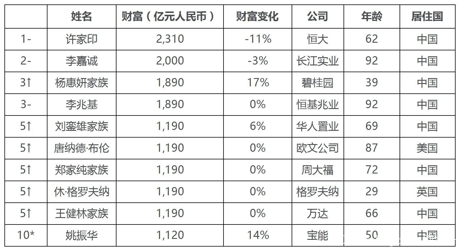 39位新面孔,其中排名最高的是奧地利Signa 42歲的Rene Benko,財富350億人民幣位列榜單第47位;19位女性,其中11位來自中國,以碧桂園楊惠妍、龍湖吳亞軍和住香港的新鴻基鄺肖卿為首;5位80後,最年輕的是來自英國的29歲的休·格羅夫納、37歲的新鴻基郭基輝,以及39歲的楊惠妍和多弗胡興榮。