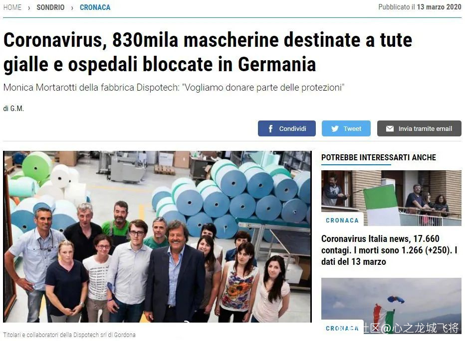 意大利此前曾向歐盟其他國家請求口罩等防疫物資援助,但沒有得到響應。意大利一家公司從中國購買了83萬隻口罩,打算捐贈給醫院和民防部門,不料被德國留下來了,引發意大利民眾譁然。