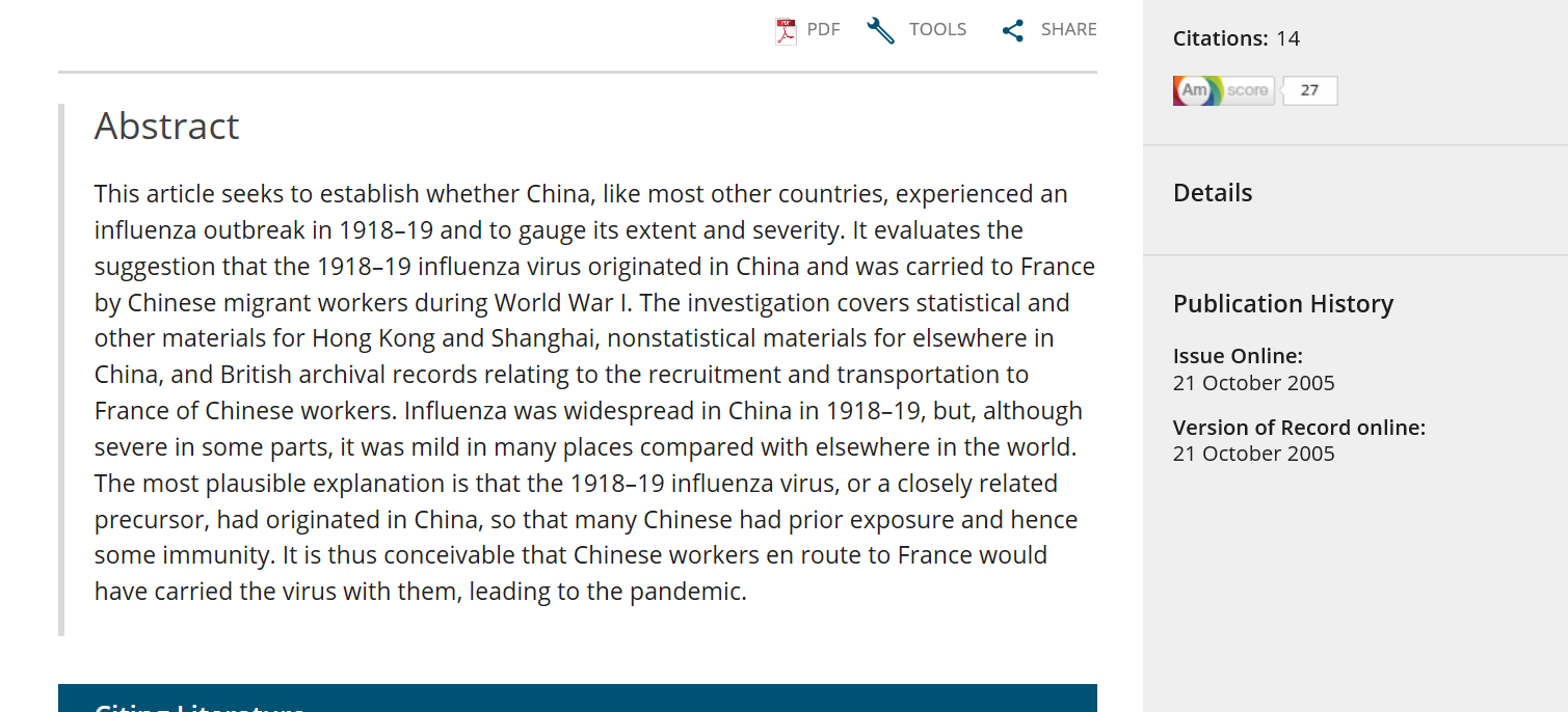 本着實事求是的精神,打開了維基百科的“西班牙流感”詞條。發現其中的病毒起源假設中確實是提到了一種源自中國的觀點。它的邏輯就是:中國在1918年大流感中受到的影響小,也許是因為中國人早就獲得了免疫,從而引出病毒源自中國的觀點。當然還有源自法國、美國,甚至在1918年流感大流行之前病毒已經存在等觀點。