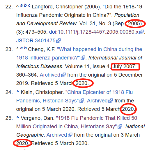 有意思的是其中援引病毒源自中國的文章,我們來看下22-25註腳。猜想西班牙流感源自中國的文章在20世紀初就已經出現,但是真正讓其重現江湖的時間節點是2020年3月。