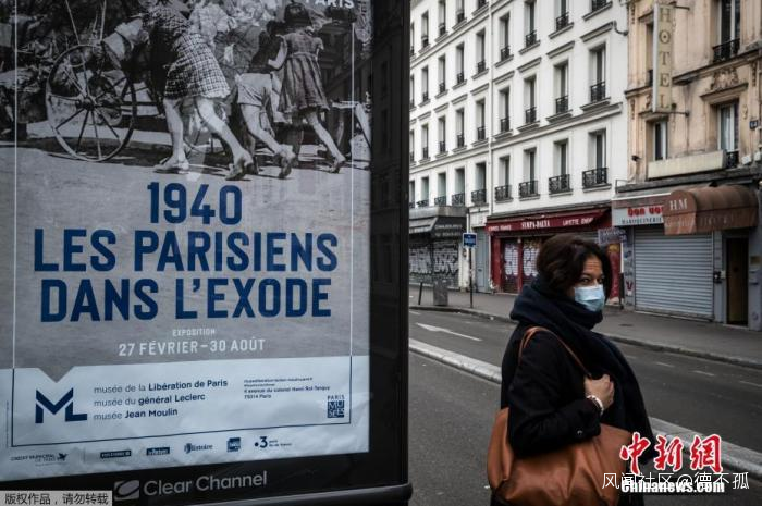 當地時間3月17日,法國巴黎,一名婦女戴着口罩步行在巴黎街頭。