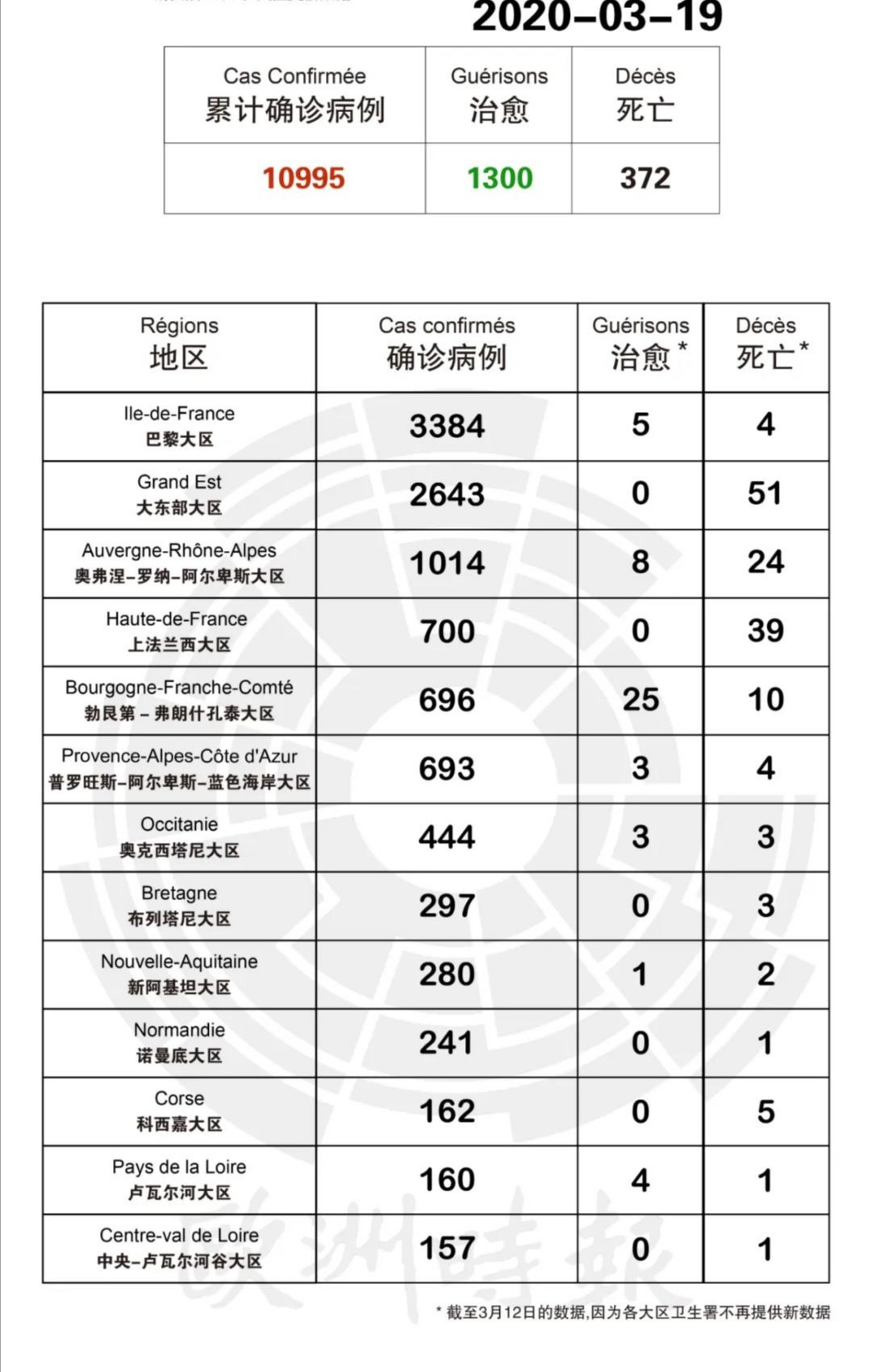 法國衞生總署署長薩洛蒙3月19日表示,法國當日新增1861例,累計確診10995例,死亡372 例(新增死亡108例),重症1122例,4461例住院治療,1300例治癒出院。